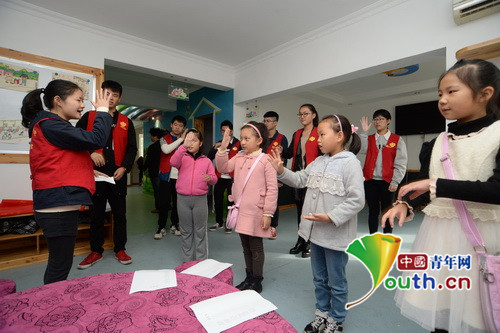 启动仪式后,浙江建设职业技术学院的青年志愿者们,来到江寺社区万向城市花园内的“育爱工坊”,与孩子们开展“感受无声”手语交流。