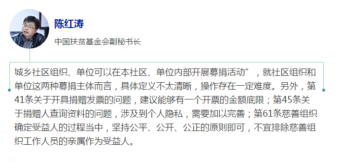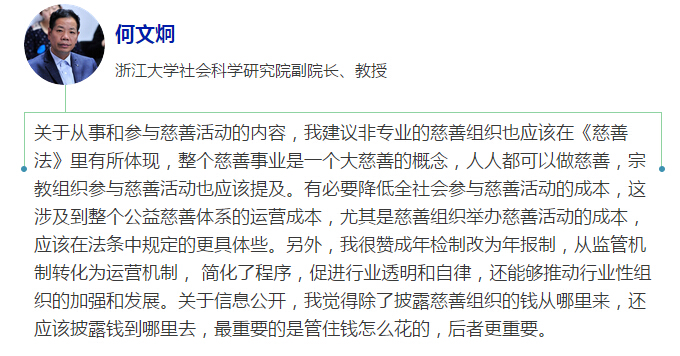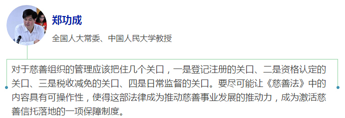 全国人大常委、中国人民大学教授郑功成,国家税务总局税收科学研究所副所长靳东升,中国人民大学非营利组织研究所所长、教授康晓光,浙江大学社会科学研究院副院长、教授何文炯,北京大学非营利组织法研究中心主任、副教授金锦萍、中国政法大学商法研究所所长、教授王涌,中国劳动关系学院公共管理系副主任、教授杨思斌,中国社会科学院法学研究所助理研究员栗燕杰,北京师范大学法学院讲师马剑银等专家学者与中华慈善总会副秘书长张心国,中国国际民间组织合作促进会副理事长兼秘书长黄浩明,中国妇女发展基金会副理事长兼秘书长秦国英,中国扶贫基金会副秘书长陈红涛,老牛基金会法律事务部部长程会田,北京亿方公益基金会副理事长陆景锴,中国专业志愿服务联益会轮值主席彭艳等来自慈善组织负责人及来自新闻媒体的代表等共18位出席研讨会并针对《慈善法》提出自己的意见。