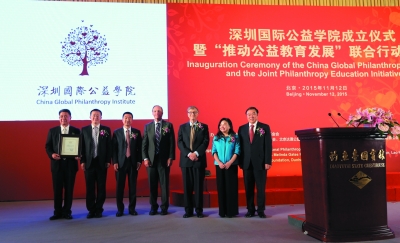 2015年11月12日,由比尔·盖茨等中美慈善家支持的中国首家国际公益学院的成立仪式在钓鱼台国宾馆举行。民政部副部长邹铭、深圳市市长许勤等领导莅临现场,比尔·盖茨、马云等百余位慈善家到场共同见证了这一时刻。