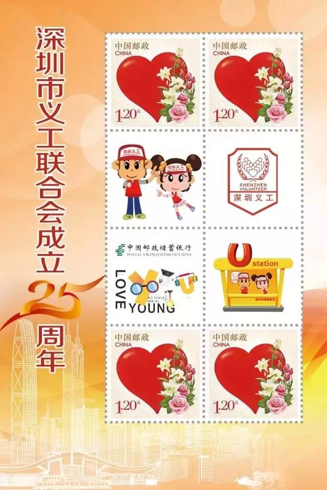据悉,本套邮票设计为红马甲样式,一套8枚,其中4枚为爱心图样主票,4枚为U站、义工等图样的个性化副票,颇具深圳义工特色。