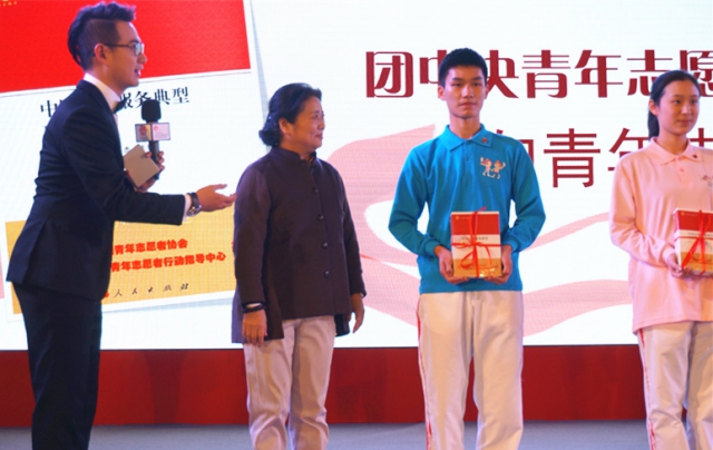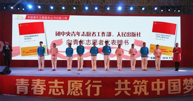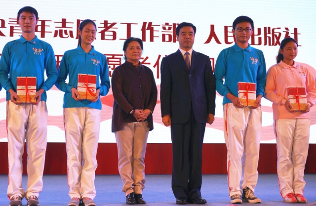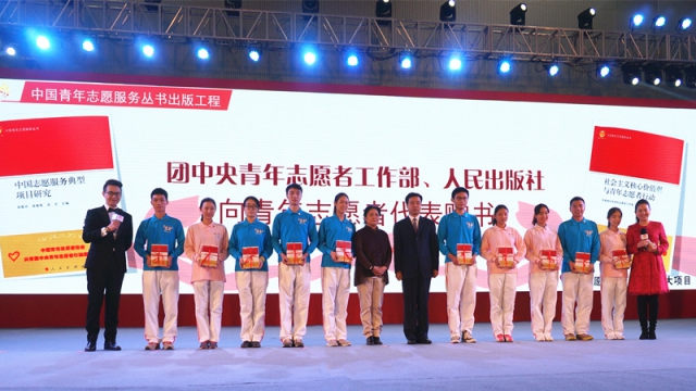 共青团中央青年志愿者工作部部长杨松和人民出版社副总编辑于青共同向青年志愿者代表赠书。