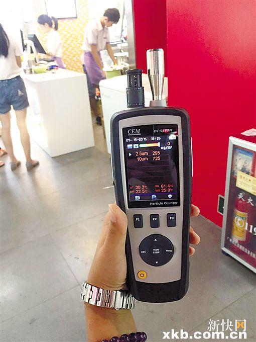 ■2015年9月15日,志愿者在广州大学城某食街,用仪器做PM2.5测量。志愿者小怡供图