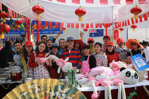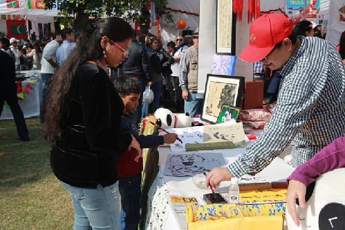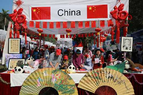 中国使馆展台人如潮,情飞扬。火红的中国结、灯笼、福字充满浓浓的中国味;书法临摹、茶艺展示、剪纸教学、快板表演等一系列传统文化项目荟萃,使馆外交官热情讲解演示,吸引众多游客驻足欣赏、踊跃参与、笑声不断;憨态可掬的熊猫玩偶、抱枕,精美的折扇、刺绣、琉璃挂件等中国特色产品畅销非凡,源源不断地卖出,饺子、包子、炒面等中国小吃现场制作、香气扑鼻、广受追捧,刚一出锅即被抢购一空。全天活动无论是人气还是销售额,中国使馆均名列前茅。