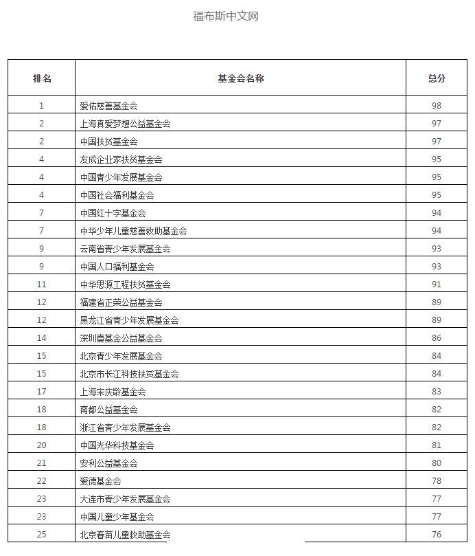 2015年12月10日,福布斯中文版推出“2015年中国慈善基金会榜”。爱佑慈善基金会首次登上榜首,上海真爱梦想公益基金会和中国扶贫基金会并列第二,友成企业家扶贫基金会和中国青少年发展基金会并列第四。在上榜的25家基金会中,有19家公募基金会,6家非公募基金会,公募基金会数量和质量上表现相对更好。