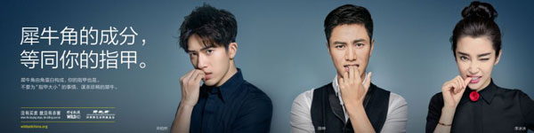 在公益广告中,三位公益大使通过咬自己的手指甲这个小小的动作,传达出一条非常重要却鲜为人知的信息:犀牛角的成分和人类指甲相同,并没有传说中的神奇药效。他们同时呼吁公众不要购买犀牛角制品,保护日益濒危的犀牛。与公益广告同时发布的还有#啃指甲救犀牛#在线活动,公众可以关注野生救援微博和微信参与#啃指甲救犀牛#话题并上传自己啃指甲的照片,与三位野生救援公益大使,以及好莱坞明星Maggie Q,中国知名摄影师陈漫和维珍集团创始人理查德?布兰森爵士一同成为“犀牛保护大使”。