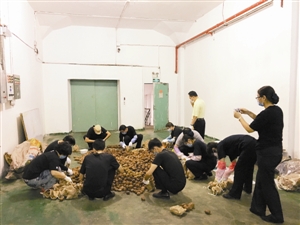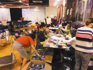 ▲为了尽快让围巾送出,几十位志愿者夜以继日的辛勤劳作,吊牌、贴纸、加盖、计数、装箱。