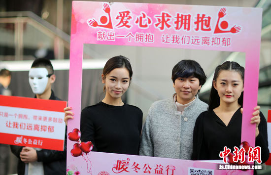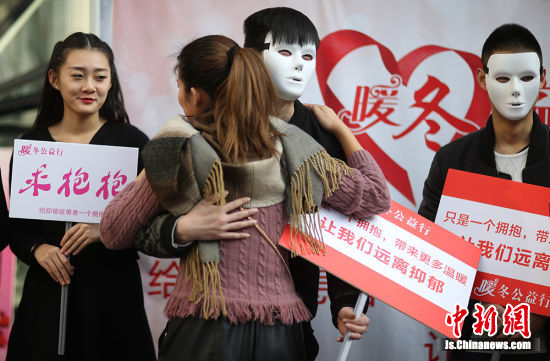 1月3日,主题为“给抑郁者患者一个拥抱”的暖冬公益行活动在南京新街口正洪街广场上举行,来自南京脑康中医院的医务人员和东南大学的大学生戴上面具、手持印有“只要一个拥抱,带来更多温暖”、“我是爱心志愿者”等字样的牌子征集市民拥抱,以此呼吁社会对抑郁症患者更多的关爱。
