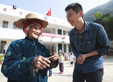 阁楼小学--山川与83岁奶奶敖桂先交谈学生情况 程伟光摄