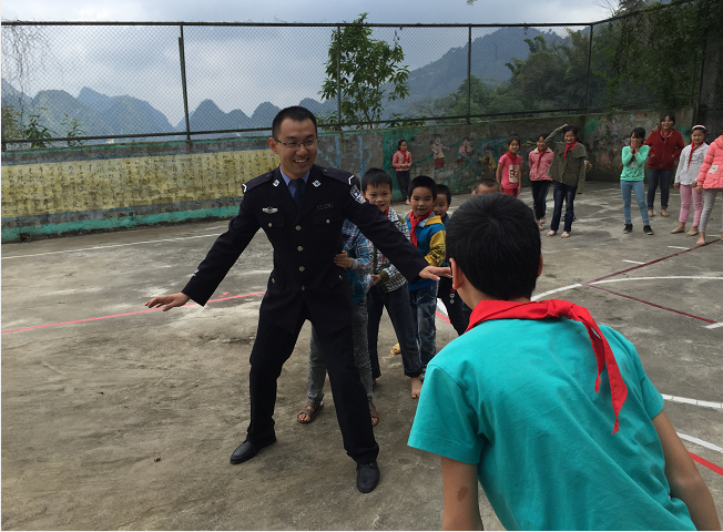 中国人民公安大学支教老师胡黎阳与学生们做游戏 程伟光摄