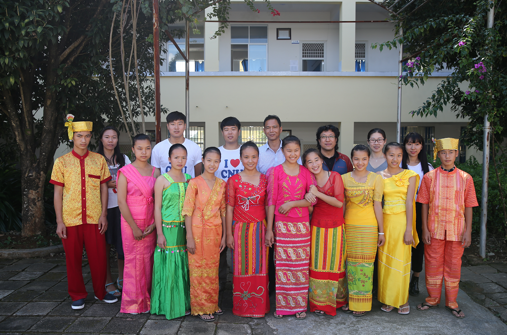 陈巍文、焦琳、徐彦龙与身着民族服装的傣族同学和相关的人员在一起