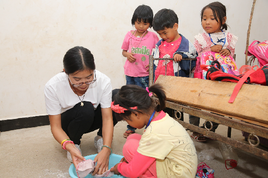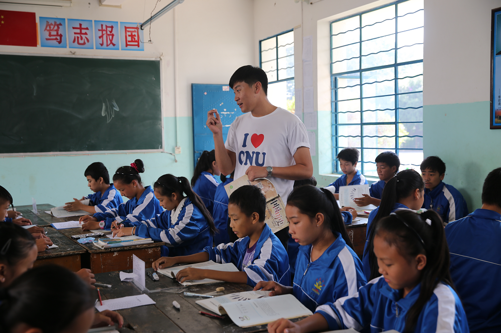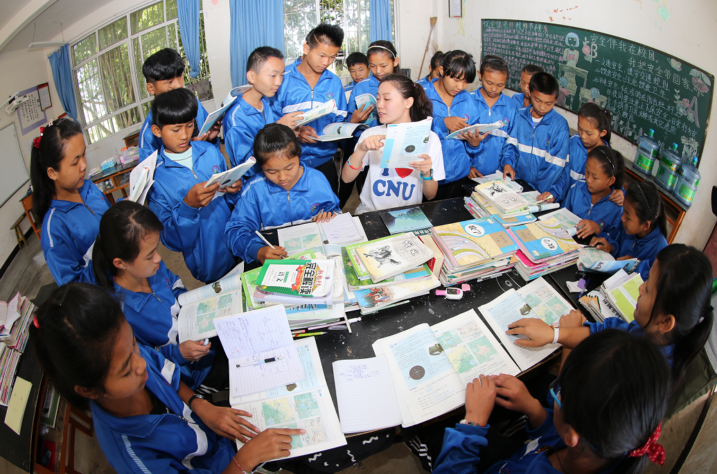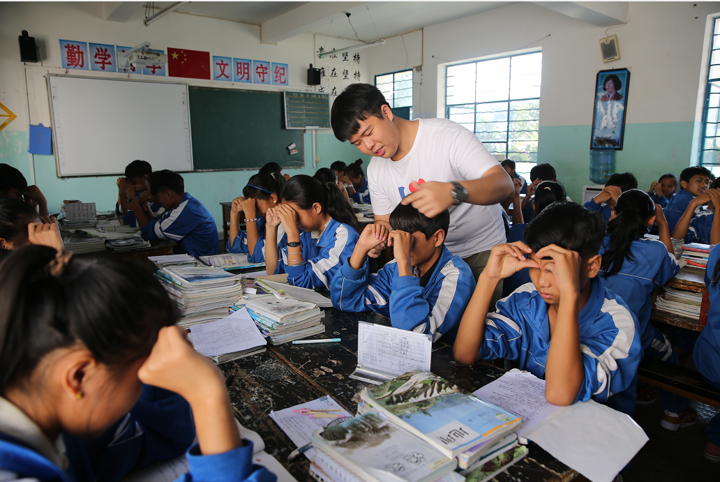 郭笑妍为三台山德昂族乡九年制学校的同学们上课