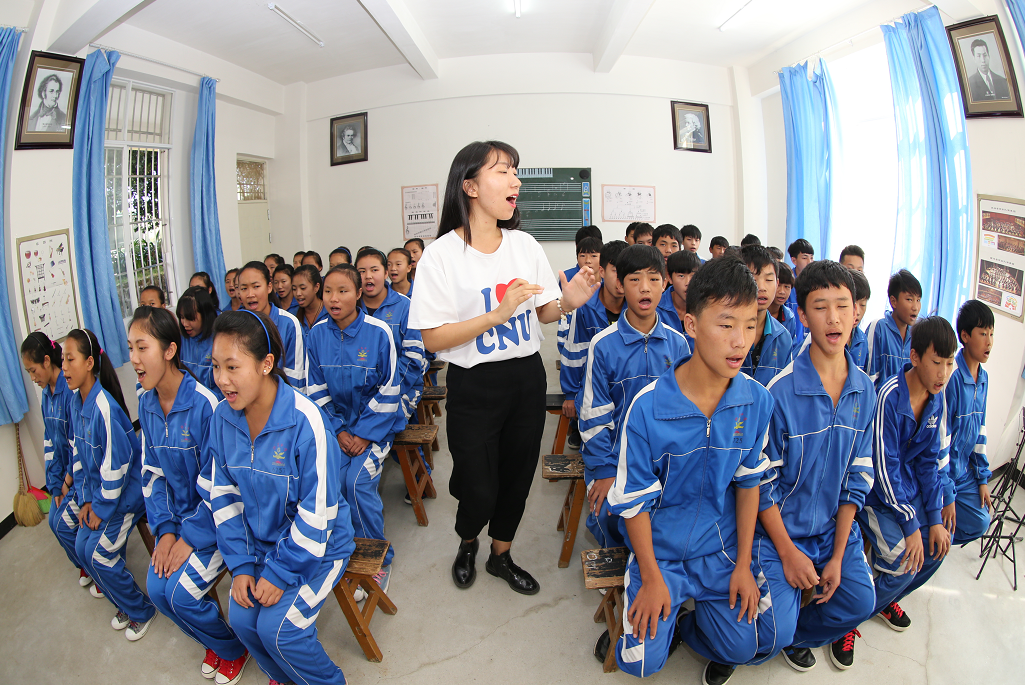 支教老师焦琳,孩时就想当一名老师,要去祖国最需要的地方发展教育,让那里的孩子去感受教育带给她们的改变和震撼。这次支教她负责八年级音乐课程、全校钢琴兴趣课、特长生声乐及视唱练耳的培训教学。在上钢琴课的时候,她遇到这样一个特别的女生,总是一个人呆呆的站在小组的电子琴边上,并且几次下来也弹不对我在课上讲的很基础的单音练习,后来其他老师过来告诉说是这名女生小时候脑子有疾病要求不用太严格。但焦琳并不想就此放弃她,反倒觉得她的身上有很多闪光的地方:她总是最早跑到音乐教室,虽然弹的不如其他同学熟练,却一直没有放弃练习,不会的时候就用大眼睛直直的盯着我,希望我能够再多给她讲一遍。知道这种情况后,再上课时我让她坐在我的身边,和我一同练习钢琴,一遍一遍的练习,几次课下来她已经可以和其他的孩子一样断断续续的弹出《小星星》了。