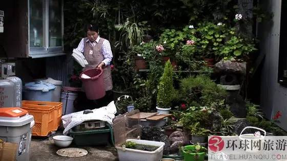 新井菊植家的小院就是最好的体现。院子里有很多被精心照料的盆栽植物,衣架上挂着清洗干净的塑料袋。有一个水桶里装着几只淡水蟹,这是新井太太从小河里捉到的。桶旁边摆放着一排用于垃圾分类的塑料垃圾箱。