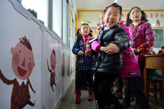 1月7日,湖北省恩施土家族苗族自治州宣恩县椒园小学的孩子们在刚刚安装了碳晶电暖板的教室里快乐玩耍。