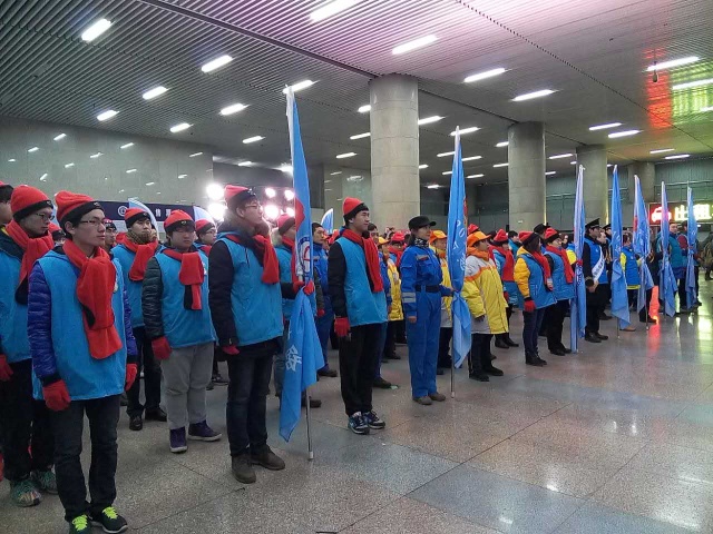 据了解,为做好今年春运“暖冬行动”服务组织实施工作,各级团组织在招募动员、岗位对接、保障激励等管理机制方面进行了大量创新探索。据不完全统计,春运首日全国将动员15万多名青年志愿者统一上岗,在火车站、机场、道路客运站、港口码头、高速公路服务区等场所,为旅客提供引导咨询、秩序维护、重点帮扶、便民利民、应急救援等服务。团北京市委组织骨干春运志愿者进行了岗前培训,并在北京西站广场设立了“蓝立方”志愿服务站,形成一道靓丽的风景线;团江苏省委在活动启动前充分筹备,深入一线摸底,统计客流量较大的城市重点交通枢纽,全力做到精准统筹岗位对接,帮忙不添乱;团湖南省委举行“最美春运志愿者”“2016春运暖心瞬间”等主题评选活动, 并为特殊岗位的志愿者筹集了800件羽绒服、1000个应急医疗包,同时还给每个市州配备了5000元食品补贴;团广东省委开启了“春运直通车”活动,为大学生和外来工提供11条线路的铁路公路春运免费票,团省委、省文明办等主办单位领导在春运首日还登上3016次列车慰问“共青团号”直通车旅客,为旅客送上新年祝福和慰问礼品,联合车站、机场、码头建立标准化、常态化的春运志愿服务阵地;团重庆市委根据服务需求开设了“服务百事通”“文明引导”“爱心互帮”“就业创业加油站”“应急工作坊”5个主题窗口开展针对性的服务, 联合铁路部门指导各车务段团委设立“爱心小屋”志愿服务阵地;团四川省委在线上开展“回家路上做志愿”,倡导春运网络文明,在线下为志愿者发放智能手环,进行绑定服务统计管理;团甘肃省委自筹200万元资金,为春运志愿者加强保障,并将关爱留守儿童纳入“暖冬行动”工作范畴。全国铁道系统近200个重点车站在春运首日集中启动上岗仪式,1万4千多名春运志愿者服务一线。全国民航系统在北京、广州、南京、福州等各大城市机场同时启动“暖冬行动”,形成良好声势。