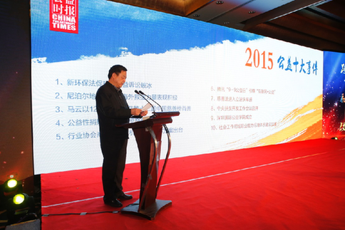 中华全国新闻工作者协会书记处书记潘岗在年会上致辞并揭晓了经过网络调查,结合行业领袖、专家、媒体等意见共同推选出的“2015十大公益新闻”,包括:马云以124亿元捐赠获第十二届中国慈善榜首善;公益性捐赠税前扣除资格确认取消;腾讯“9·9公益日”引爆“互联网 公益”;慈善法进入立法快车道;中央扶贫开发工作会议召开;深圳国际公益学院成立;新环保法促环境公益诉讼破冰;行业协会商会与行政机关脱钩总体方案出台;社会工作领域职业能力标准体系建设加速;尼泊尔地震,中国海外救援力量表现积极。