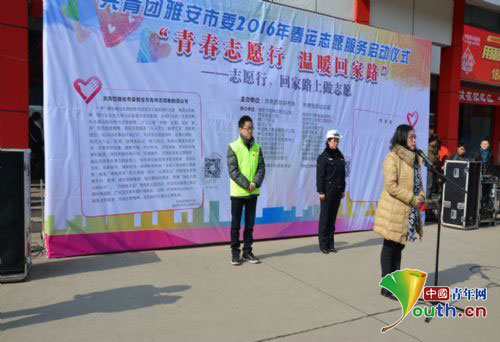 中国青年网北京1月28日电(记者 张建伟 通讯员 唐世林)为凝聚青年力量,传递志愿者服务精神,日前,由共青团雅安市委、共青团雨城区委主办,雅安市青年志愿者协会、雨城区青年志愿者协会承办的“青春志愿行 温暖回家路”——志愿行,回家路上做志愿,雅安市2016春运志愿服务活动在旅游车站正式启动。团市委副书记陆艳、雨城区团委副书记杨浦等出席了本次活动,雅安市公安局交警支队、雅安市人民医院、雅安市建安公司、雅安市烟草公司、雅安市联通公司、中国电力雅安分公司、雅安银监分局、以及雅安本土社会组织,雅安市应急救援服务中心等18支春运志愿服务队参加了启动仪式。