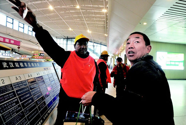 图为:昨日,武汉火车站,一名留学生志愿者为乘客指路。