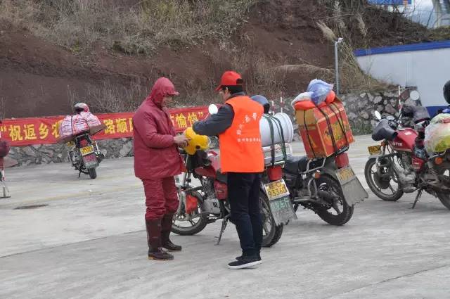 1月30日,团寻乌县委组织青年志愿者在206国道寻乌段南桥交警中队旁搭设便民服务点,为骑摩托车返乡的外出务工人员提供便利服务。