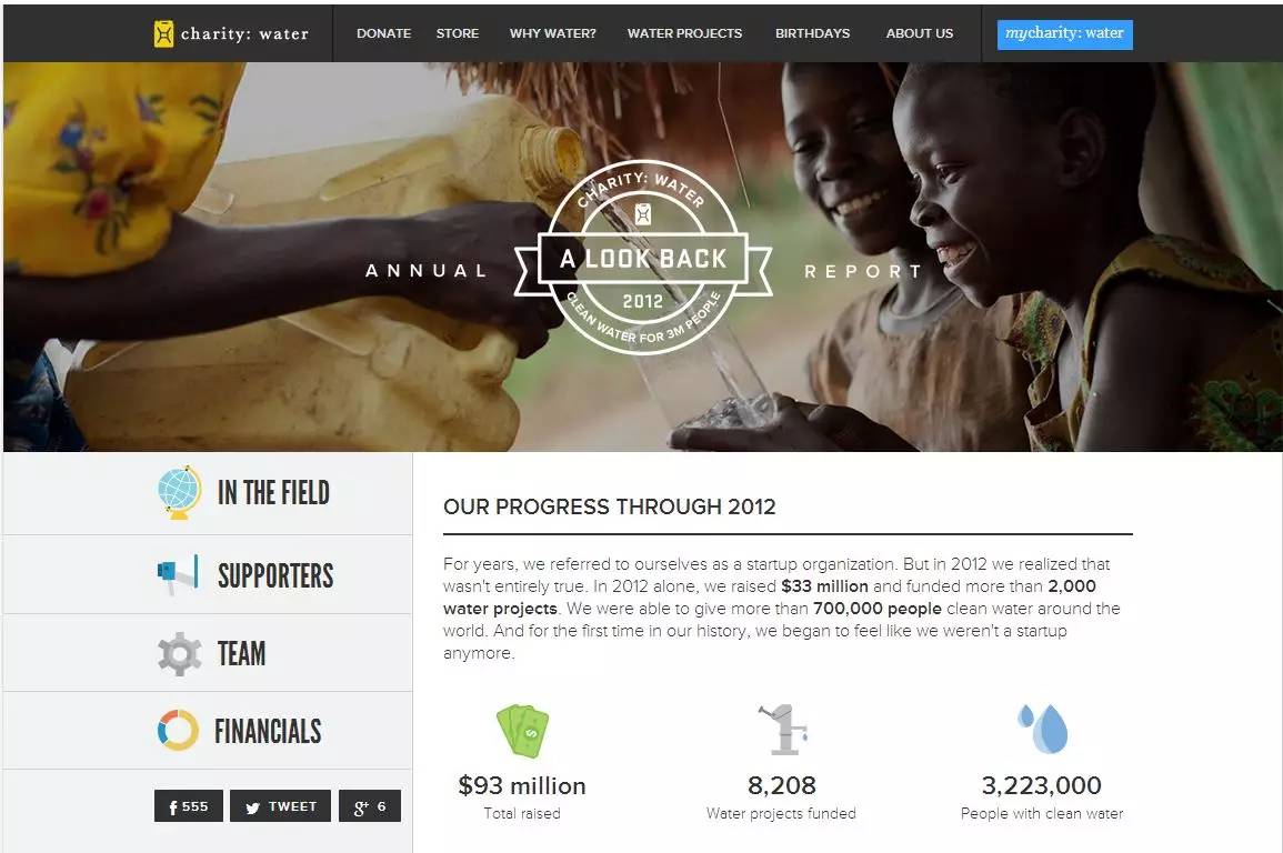 Charity:Water是个来自美国的非营利组织,他们致力于提供发展中国家人民洁净而可安全饮用的水源,并且承诺捐款人他们的募款和工作进度都要完全透明,每一分钱都要用在跟洁净水源有关的工程项目上,因为他们相信完整的信息揭露,才能带来完全的责信;所以他们网站的年报里不仅列出年报,也列出会计师事务所和美国国税局审查过的帐务报告,更令人感动的是,他们为了让捐款人能够更了解他们的工作,花了许多心思把工作成果化为图表和数字,让我们都能一目了然,图片里是他们在2012年的电子版年报。截至2012年,Charity:Water 一共募到了9千3百万美金,在全世界打造了8千208口水井,并且为3百多万人带来干净的饮用水,大家如果有时间,也可以到他们的网站去朝圣一下,看看他们多么以自己的成果和诚实为荣。