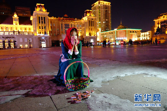 2016年1月31日的哈尔滨,三十年不遇的寒潮刚刚退去,大地依旧被禁锢在冰点以下。人们将自己裹在厚厚的羽绒服下,期盼着春暖花开的来年。可是在哈尔滨市果戈里书店、哈西客运站、哈西万达商场、道里松雷商场、太平百盛商场等繁华区域,你会发现一个从童话里穿越过来的小女孩,身穿单薄的衣衫,挎着一个装满火柴的小篮子,向周围的人发放着一盒盒的火柴。