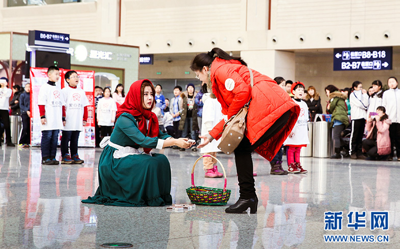 在哈西客运站里,一场“卖火柴的小女孩”的情景剧正在上演:一位衣着单薄的小女孩,挎着一个装满火柴的小篮子缓缓地走来,慢慢地跪坐在地上,寒风中小女孩蜷缩一团,火柴撒满周围,远处走来了路人,看见这个可怜的小女孩,纷纷上来购买她的火柴,忧伤从小女孩脸上退去,身着“爱心衣橱”志愿者服装的学生们欢快地跳起了“快闪”,在黑龙江省曲艺团国家一级演员刘冰歌优美的《火柴天堂》歌声里,小女孩高兴地和大家融入一起,脸上洋溢着欢乐的笑容。情景剧的表演引来了旅客纷纷驻足,每次演出完周围都响起热烈的掌声。