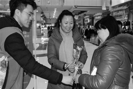 昨日情人节,绥中爱心志愿者穿梭在各大商场义卖鲜花。辽沈晚报、聊沈客户端驻葫芦岛特约记者 胡清 摄