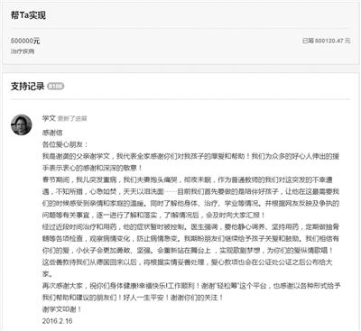 昨日,谢先生在轻松筹的项目平台上发了一封感谢信,他表示,经过近一段时间的治疗和用药,谢同学的症状暂时被控制。在感谢信中,他没有回应网友和捐款人的质疑,只表示“根据网友反映及争执的问题等有关事宜,逐一进行了解和落实,了解情况后会及时向大家汇报”。至于如何处理善款,他表示“从德国回来以后将根据事情妥善处理,爱心款项也会在公证处公证之后再公布”。