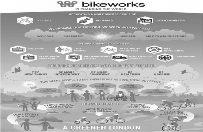Bikeworks也是少数几个坚持“三重底线”原则的社会企业之一,实行经济效益、社会效益与环境效益相结合的商业模式,这在一定程度上归因于戴维和吉姆的愿景,即:以自行车为媒介开展各种不同的活动,从而达到不同的目的。此外,在某一固定地点开展多种活动,也具有十分重要的意义:人们到这里修车或买车,能顺便了解该组织进行的其他活动(培训和就业计划),社区归属感和相互联络也随之增强。