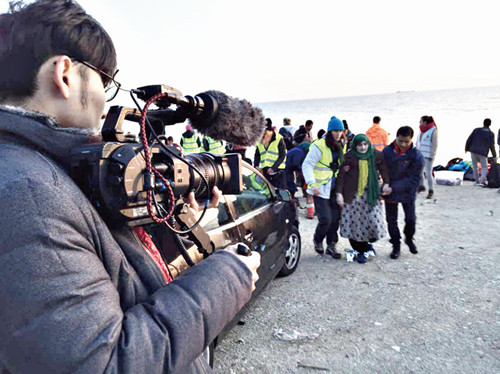 志愿者在难民登陆现场进行拍摄记录工作。(法国《欧洲时报》意大利/欧丽福 摄)