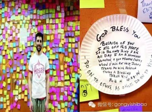 在美国费城,有一家特别火爆的比萨店。从门脸看,这家店没什么特别,但一进门,顾客首先看到的不是桌椅板凳,而是贴满整面墙的五颜六色的便利贴。很多人通过它表达感谢:“上帝会祝福你,这是我今天吃到的唯一一餐。”“谢谢店老板,我现在又有了工作,明天就会上班。”……