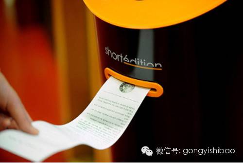 为了培养市民的阅读习惯,充分利用零碎时间,法国Grenoble市政府和出版社共同策划了一个公益项目:在车站、餐厅等公共场所放置短篇小说售卖机,即上图中的机器。这种机器由一家名为shortedition 的出版商推出,目前已经摆放了八台设备,分布在旅游局、图书馆、社区中心等公共场所。