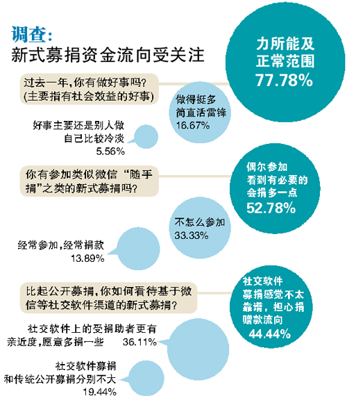 业内怎样看这个问题?谈及年轻人参与公益的形式,北京的公益组织瓷娃娃中心志愿者张皓宇认为,现在网络捐助方式比较流行,往往会采取互联网尤其是移动互联网上的公益捐赠项目进行捐助,比如在朋友圈里参与大家转发的公益项目,或在淘宝购物时选择一些公益项目进行捐款。而除了捐款之外,有参与度的公益活动肯定更受欢迎,比如运动筹款,捐赠“步数”,参与一些网络互动,比如像冰桶挑战之后有微笑挑战、饥饿挑战、减衣挑战等等,还有就是线下的活动,包括做志愿者等。