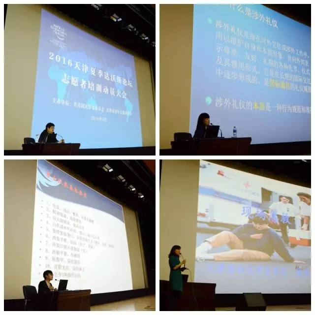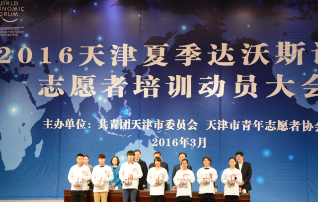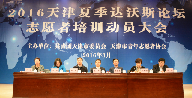 为了使志愿者更好地为2016天津夏季达沃斯论坛提供服务,大力弘扬“奉献、友爱、互助、进步” 的志愿精神,在3月5日——学雷锋纪念日到来之际,天津夏季达沃斯论坛筹备办、团市委在天津工业大学艺缘影厅举行志愿者培训动员大会。由论坛志愿者、礼仪志愿者和城市运行志愿者组成的890余名达沃斯论坛志愿者将接受系统培训,为顺利进行夏季达沃斯论坛志愿服务提前做好准备。