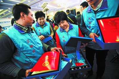 五星级志愿者代表领取证书、奖章及实名志愿者马甲。本报记者方非摄