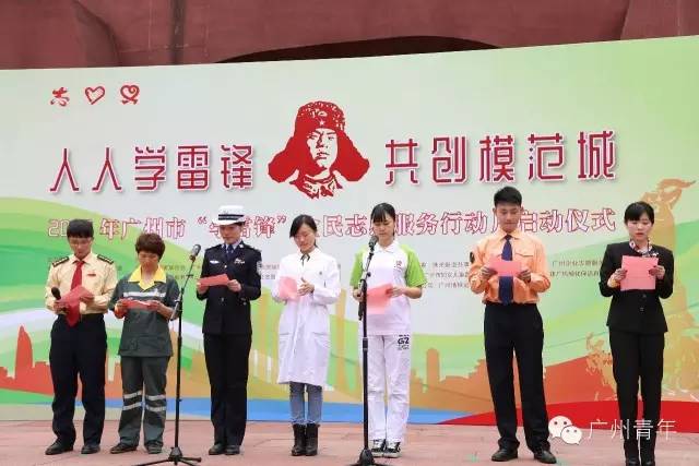 3月5日下午,2016年广州市“学雷锋”全民志愿服务行动月集中行动日活动在团一大广场开展,现场180名新注册志愿者庄严宣誓,加入广州志愿者行列,他们其中70%以上都是共产党员,分别来自市委宣传部、市直机关工委、市检察院、广州图书馆、广州地铁、广州城投集团等单位。