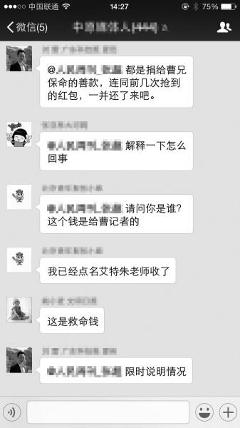 3月6日中午11点50分,曹磊的朋友石先生将求助信息转发到一个同行老乡群里。15点17分,群友邵某在微信群里发了一个100元的微信红包,并呼叫石先生代收。红包刚发出去就被群友陈某抢走,陈某意识到抢错后立即退回。此时,该红包又被微信名为“李超”的人抢走。群友纷纷呼叫“李超”,要求其退回善款,但他迟迟没有回应。