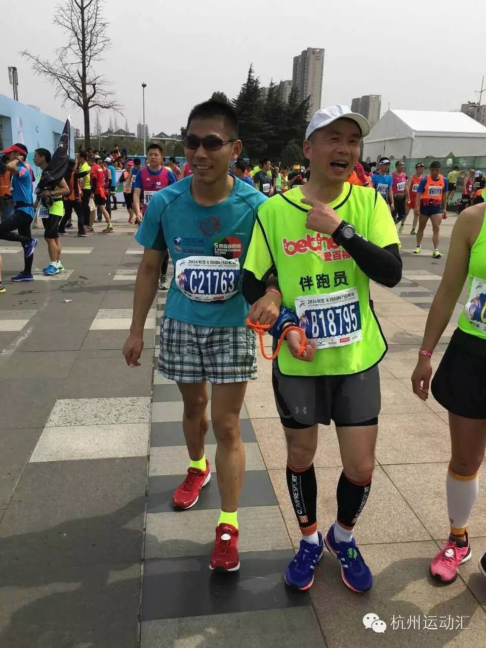 这位全盲的跑友在“牵引绳”的带领下