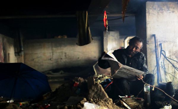 在城南的一个建筑物的下面,当初为了防潮而凌空架起,形成了一个废弃“地下室”,久而久之变成了流浪汉们居住的点,遮蔽用几把破伞,取暖就只有点柴禾。春暖花开,腐臭味道渐浓,地面潮湿得很,容易滋生跳蚤之类寄生虫,他们用火在身上燎烤止痒,总觉得有点不安全。(来源:快拍快拍网朱克增)