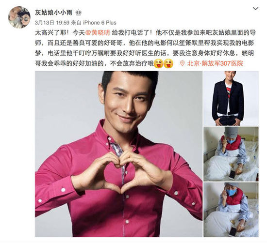向上看!原来黄晓明又!在!做!公!益!据小编去查了下资料所了解,这个微博博主“灰姑娘小小雨”因参加过一档央视真人秀节目和黄晓明结识,她身患白血病,已经接受化疗治疗8次,但其乐观积极努力向上的态度,引起了黄晓明的关注,之后黄晓明对她的帮助就一直没有间断,帮她实现演员梦,安排在电影《何以笙箫默》中有角色出演,完成梦想。后续治疗过程中黄晓明又以各种方式,精神支持、物质帮助持续关心,难怪在微博评论中看到有网友说:“快被暖哭了。。。。。。黄晓明才是大白啊!”黄晓明这次为了能和“灰姑娘小小雨”多待一会,居然还误!了!灰!机!