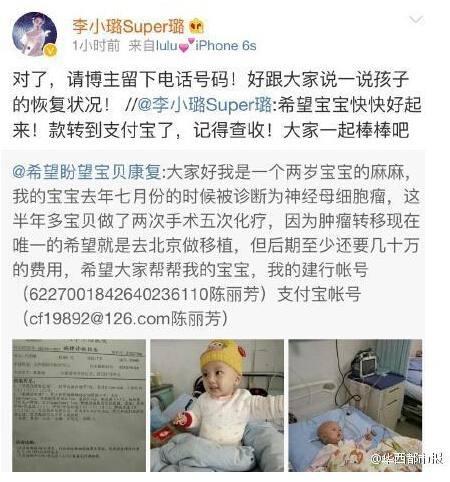 3月26日下午六点左右,李小璐转发了一个名为“希望盼望宝贝康复”的微博,该博主晒出自己两岁宝宝在医院的照片及诊断报告,求助称:“我是一个两岁宝宝的麻麻,我的宝宝去年七月份的时候被诊断为神经母细胞瘤,唯一的希望就是去北京做移植治疗,但后期至少还需要几十万的费用,希望大家帮帮我的宝宝。”