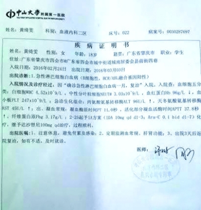 很快,黄绮雯就将包括白血病报告结果、身份证照片、病床照和一封名为《青春绽放的白血病黄绮雯的呼喊:“救救我”》的手写信传给对方,不久后,她的救助信息出现在了“白血病公益救助会”的微信公众号上。