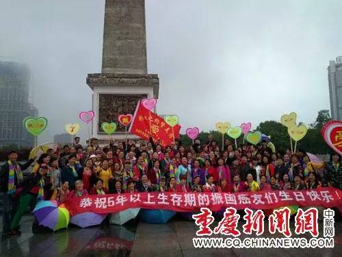 第22届全国肿瘤癌症防治周即将到来,全国彩丝带爱心传递重庆工作站的志愿者们10日在两江幸福广场为重庆病友(5年以上癌龄)举办了一场特别的集体生日,百名癌症患者齐唱《生日歌》,大呼 “我们活了!”