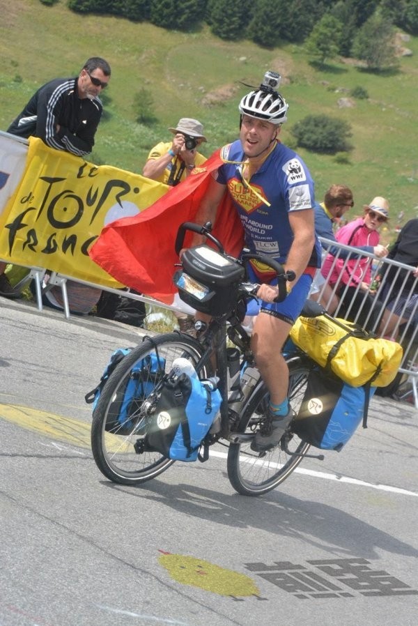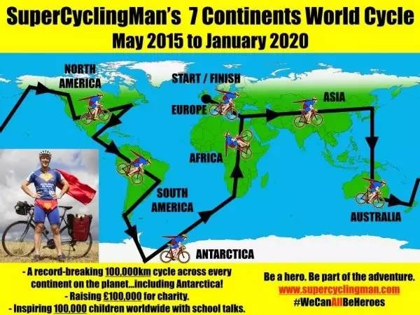 身着红披风和蓝色紧身衣,Will Hodson开始了他的冒险旅程。他计划骑单车环游全球,包括南极洲。为了给一个慈善机构募款,同时传达“每个人都可以成为超级英雄”的理念。