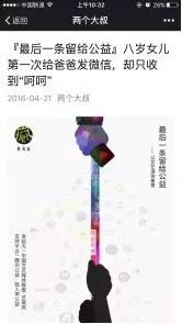 (“两个大叔”等公众号已于本月21日参与活动,将推送消息的最后一条留给了公益项目的传播,取得了不错的关注度)
