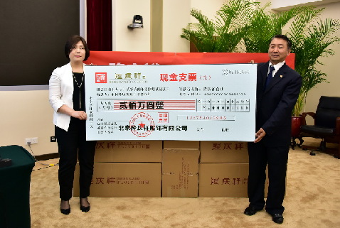 捐助方向中国环境新闻工作者协会秘书长刘国正递交支票。摄影/章轲