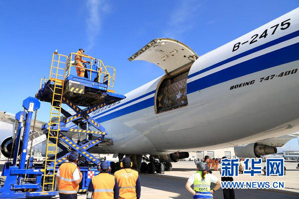 4月27日,在厄瓜多尔首都基多的苏克雷国际机场,机场工作人员卸载中国援厄首批救援物资。中国政府向厄瓜多尔地震灾区提供的首批紧急救援物资当地时间当日上午抵达厄瓜多尔。 新华社记者郝云甫摄
