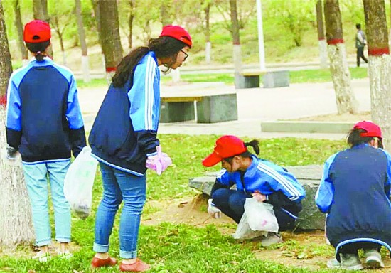 一高校大学生双休日参加文明校园督查活动,正在草坪捡拾垃圾。郑州大学 董健鹏/摄
