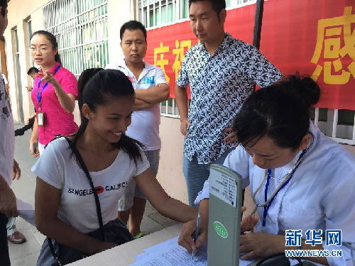 5月3日,医生为志愿者量血压。当天,海南百余名志愿者用献血的方式为“五四青年节”留下青春的印记。冒着炎热的天气,志愿者井然有序的排队填写表格,经过医生的检查后在献血车外等候献血。新华网发(乐宁摄)
