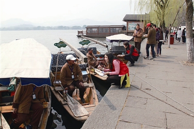 下城区社区学院党员们向西湖船夫、景区公交车司机、景点保安等宣传G20基础知识。